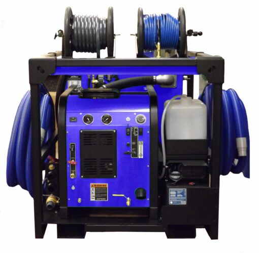 The complete self-contained, turn-key system can be transported via flatbed or pick-up truck, van, trailer, or even an industrial cart. As the unit provides its own power, no electricity is needed. The complete system includes: a wastewater recovery tank; high capacity automatic wastewater disposal system (for pumping wastewater to an on-location sanitary sewage access point); fuel tank; vacuum and solution hoses mounted on a high capacity hose reel; and a cleaning and extraction wand. In addition, the TMTG uses a state-of-the-art heat exchange system to heat the cleaning solution, eliminating the need for a second fuel source required for hot water pressure washers.